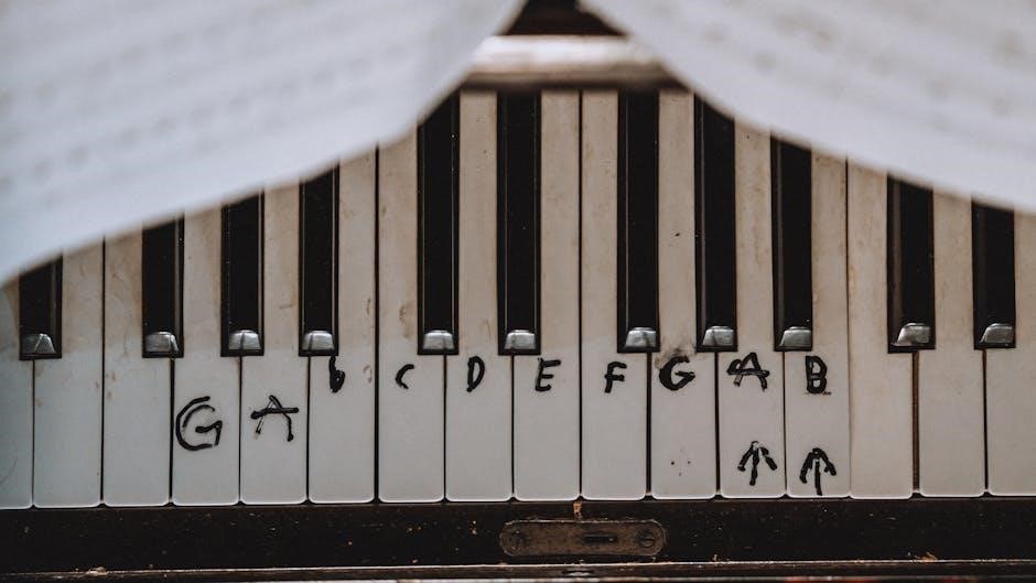 Black keys represent sharps and flats, altering the pitch of adjacent white keys. A PDF guide will visually demonstrate how to locate each note consistently across the keyboard. Recognizing these patterns quickly is crucial for reading music and developing keyboard familiarity. Many beginner resources emphasize this foundational knowledge, often including diagrams and exercises to aid memorization. Mastering key names unlocks the ability to navigate the instrument confidently.